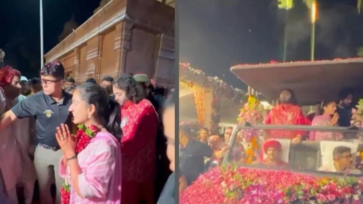 दरअसल मुंबई में शादी के सेलिब्रेशन के बाद अनंत अम्बानी और राधिका मर्चंट मंगलवार को मुंबई के प्राइवेट कलीन एयरपोर्ट से गुजरात के जामनगर के लिए रवाना हुए और रात में पहुंचे. यहाँ पहुंचते ही इनका ग्रैंड स्टाइल में स्वागत हुआ. एयरपोर्ट के एग्जिट गेट पर ही फूलों की चादर थी इसके अलावा भव्य डेकोरेशन भी था.. आपको याद होगा कि इस शादी का प्री वेडिंग जामनगर से शुरू हुआ था... जिसमे बॉलीवुड की दिग्गज हस्तियां शामिल थी..