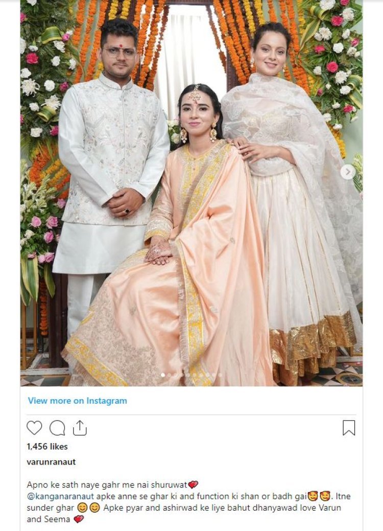 दरअसल चुनाव से फुर्सत मिलते ही कंगना अपने परिवार के साथ जश्न मना रही हैं. ऐसे में वो हर एक पल को जी रही हैं और उन्हें अपने फैंस के साथ शेयर कर रही हैं.. तस्वीरों को शेयर करते हुए उन्होंने अपने चचेरे भाई वरुण रनौत और भाभी को शादी की बधाई भी दी है... ऐसी खबरें आ रही हैं कि कंगना रनोत ने इस नए जोड़े को चंडीगढ़ में एक खूबसूरत सा घर गिफ्ट किया है...