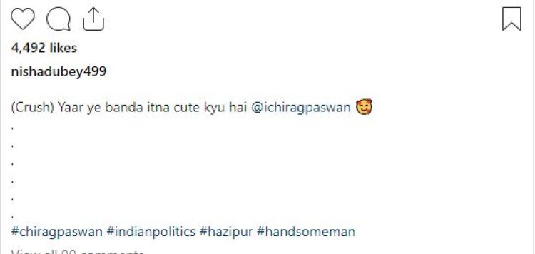 निशा ने अपने इंस्टाग्राम अकाउंट पर चिराग पासवान का एक वीडियो शेयर किया है. इस वीडियो में चिराग पासवान शपथ लेते हुए नजर आ रहे हैं. इस क्लिप पर लोग जमकर रिएक्ट कर रहे हैं. निशा ने चिराग के इस वीडियो को शेयर किया और जमकर अपना प्यार लुटाया. वीडियो में चिराग पासवान को टैग करते हुए निशा ने कैप्शन में लिखा, 'यार ये बंदा इतना क्यूट क्यों है.'