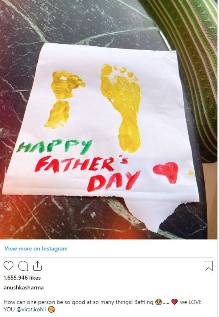 अनुष्का शर्मा ने जो तस्वीर शेयर की है उसमे एक पेंटिंग्स नजर आ रही है. जिसमें एक व्हाइट पेपर पर दो यलो पैरों के निशान बने है. इसमें वामिका के पैर और दूसरा अकाय के पैर का निशान है. जिसके नीचे रेड कलर से 'हैप्पी फादर्स डे' लिखा हुआ है.