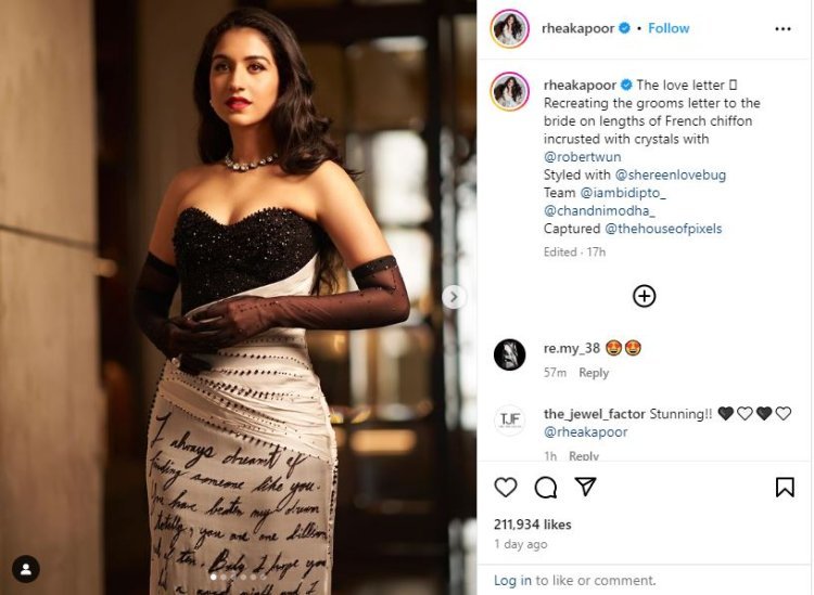 जिसके बाद फैंस राधिका को निहारने से खुद को रोक नहीं पा रहे हैं. इन तस्वीरों में राधिका ने सबका ध्यान अपनी तरफ खींच लिया है. दरअसल राधिका मर्चेंट ने एक फोटो में ब्लैक न वाइट कलर का गाउन पहना है जिसमे बड़े बड़े अक्षरों में कुछ लिखा हुआ है. इस ब्लैक एंड ऑफ व्हाइट गाउन पर डिजाइनर रॉबर्ट वुन ने काफी मेहनत की थी. इस ब्लैक एंड ऑफ व्हाइट गाउन पर डिजाइनर रॉबर्ट वुन ने काफी मेहनत की है. राधिका के इस गाउन पर उनका लव लेटर लिखा हुआ है. जो बेहद खास था. इस बात का खुलासा रिया ने फोटोज के कैप्शन में किया है, उन्होंने लिखा- प्रेम पत्र. जैसे ही इस गाउन की फोटो सोशल मीडिया पर वायरल हुई इस गाउन ने सबकी नज़रें अपनी तरफ खींच ली.