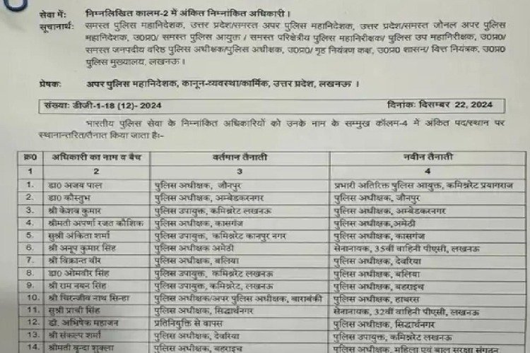 उत्तर प्रदेश सरकार ने कानून-व्यवस्था सुधारने और प्रशासन को अधिक प्रभावी बनाने के उद्देश्य से 15 आईपीएस अधिकारियों का तबादला किया है. इन अधिकारियों को उनके अनुभव और कौशल के आधार पर नई जिम्मेदारियां सौंपी गई हैं. खासतौर पर महिलाओं की सुरक्षा, अपराध नियंत्रण और प्रशासनिक सुधार को ध्यान में रखते हुए यह कदम उठाया गया है