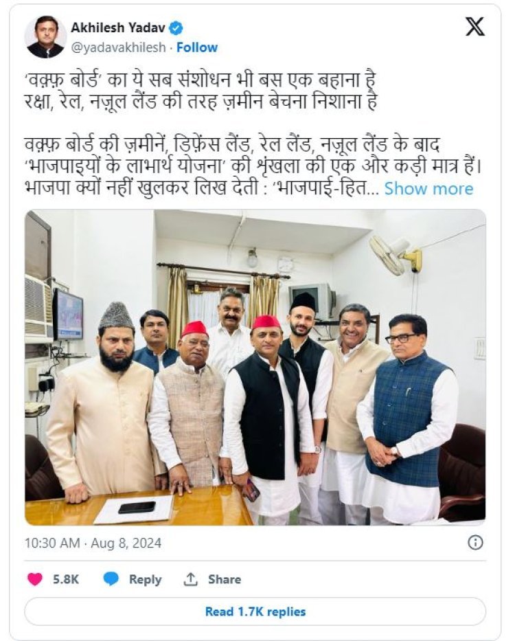 भाजपा पर निशाना साधते हुए यादव ने आरोप लगाया कि वक्फ बिल में संशोधन भाजपा के हित में जारी किए गए हैं और यह भाजपा को लाभ पहुंचाने वाली योजनाओं की श्रृंखला की एक और कड़ी मात्र है. ट्वीट में आगे कहा गया है कि रक्षा भूमि, रेलवे भूमि और नजूल भूमि के बाद वक्फ बोर्ड की भूमि 'भाजपा के लाभ की योजनाओं' की श्रृंखला की एक और कड़ी मात्र है. भाजपा खुलकर क्यों नहीं लिखती: 'भाजपा के हित में जारी'. सपा प्रमुख ने आगे यह भी मांग की कि वक्फ बोर्ड की भूमि नहीं बेची जाएगी, इसकी लिखित गारंटी दी जानी चाहिए.