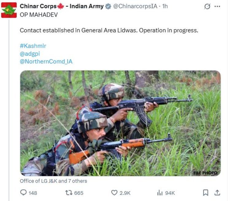 मुठभेड़ श्रीनगर के लिदवास क्षेत्र में महादेव पर्वत के पास शुरू हुई, जब सशस्त्र बलों को तीन विदेशी आतंकवादियों की मौजूदगी की जानकारी मिली.
