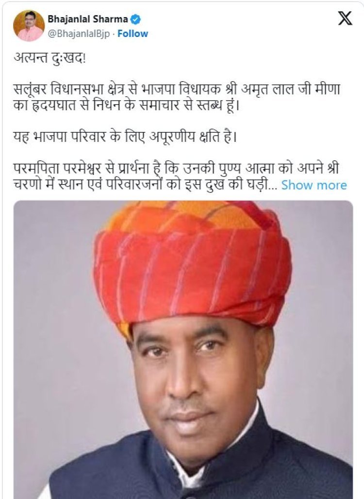 भारतीय जनता पार्टी (भाजपा) के तीन बार के आदिवासी विधायक अमृतलाल मीना, जिनकी आयु 64 वर्ष थी, का बुधवार को हृदयाघात से निधन हो गया. राजस्थान के मुख्यमंत्री भजन लाल शर्मा ने एक्स पर एक शोक संदेश में लिखा कि सलूम्बर विधानसभा क्षेत्र से भाजपा विधायक श्री अमृत लाल जी मीना के हृदयाघात से निधन की खबर से स्तब्ध हूं. यह भाजपा परिवार के लिए एक अपूरणीय क्षति है. मैं परमपिता परमेश्वर से प्रार्थना करता हूं कि उनकी पवित्र आत्मा को अपने श्रीचरणों में स्थान दें तथा उनके परिजनों को इस दुख की घड़ी में शक्ति प्रदान करें. ओम शांति!