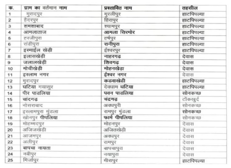 भोपाल: मध्य प्रदेश के देवास जिले के 54 गांवों के नाम बदलने के आदेश दिए गए हैं. मुख्यमंत्री मोहन यादव ने इसे लेकर अधिकारियों को प्रक्रिया शुरू करने निर्देश दे दिए हैं. सोमवार को मुख्यमंत्री मोहन यादव देवास जिले के सोनकच्छ गांव में आयोजित एक कार्यक्रम में शामिल हुए थे. जहां भाजपा अध्यक्ष ने मुख्यमंत्री से मांग की कि जिले के 54 गांवों का नाम बदल दिया जाए.