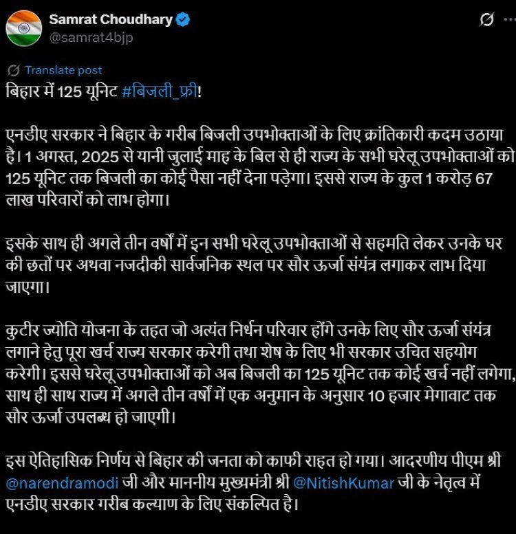 ऐसे तमाम सवाल सोशल मीडिया पर तैरने लगे हैं, तो इन सबका जवाब तसल्ली से समझिए. ये हैं बिहार के डिप्टी सीएम सम्राट चौधरी, जो ट्वीट कर लिखते हैं, ''125 यूनिट फ्री के तहत 100 फीसदी अनुदान दिया जा रहा. इस वित्तीय वर्ष में 3375 करोड़ अतिरिक्त अनुदान दिया जाएगा. 1 करोड़ 67 लाख ऐसे लोग है जो 125 यूनिट से कम बिजली खपत करते हैं. इसके बाद अगले तीन साल में सबके घरों की छत्तों पर सहमति से सौर ऊर्जा संयंत्र लगाया जाएगा. राज्य में करीब 10 हजार मेगावाट बिजली बनेगी.''