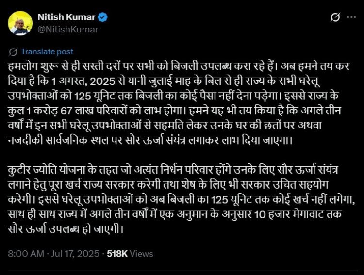...ये बिहार के मुख्यमंत्री नीतीश कुमार का ट्वीट है, जो लिखते हैं, ''1 अगस्त 2025 से सभी घरेलू उपभोक्ताओं को 125 यूनिट बिजली फ्री मिलेगी. 1 करोड़ 67 लाख परिवारों को इसका फायदा मिलेगा.'' लेकिन सवाल है इससे बिहार के खजाने पर क्या बोझ नहीं पड़ेगा. विपक्ष यही सवाल नीतीश कुमार से पूछ रहा है. क्या जेडीयू और बीजेपी की जोड़ी वही गलती करने जा रही है, जो दिल्ली में आम आदमी पार्टी ने की थी, जो फ्री बिजली के नाम पर अरविंद केजरीवाल को कोसते थे, वही नेता अब फ्री बिजली का समर्थन कैसे कर सकते हैं.