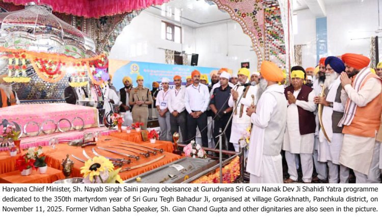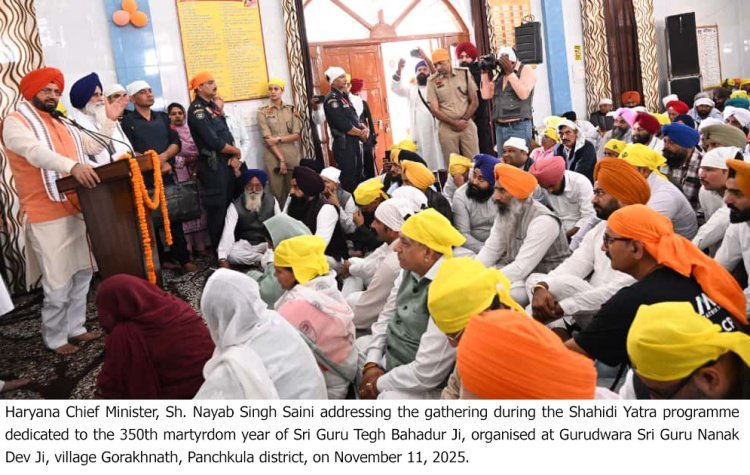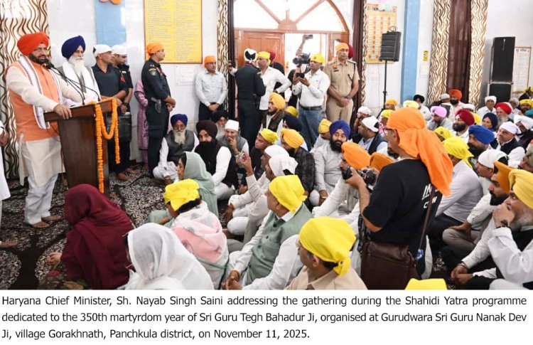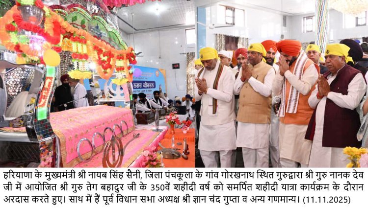मुख्यमंत्री नायब सिंह सैनी ने कहा कि श्री गुरु तेग बहादुर जी केवल सिख समुदाय या भारत के ही नहीं, बल्कि पूरे विश्व के मानवाधिकारों के प्रथम महानायक हैं. उन्होंने धर्म औ‘हिंद की चादर’ श्री गुरु तेग बहादुर जी के 350वें शहीदी वर्ष के पावन अवसर पर मंगलवार को दूसरी पवित्र नगर कीर्तन यात्रा का शुभारंभ हरियाणा के पंचकूला जिले के पिंजौर स्थित पावन भूमि से हुआ. इस अवसर पर हरियाणा के मुख्यमंत्री नायब सिंह सैनी की उपस्थिति में गुरुद्वारा श्री गुरु नानक दरबार, गांव गोरखनाथ में अरदास कार्यक्रम का आयोजन किया गया. मुख्यमंत्री ने श्री गुरु ग्रंथ साहिब के समक्ष अरदास करते हुए प्रदेशवासियों की सुख-समृद्धि और खुशहाली की कामना की. कार्यक्रम के दौरान मुख्यमंत्री ने गवर्नमेंट पॉलिटेक्निक, अंबाला का नाम श्री गुरु तेग बहादुर जी के नाम पर रखने की घोषणा भी की.र देश की रक्षा हेतु सर्वोच्च बलिदान दिया. मुख्यमंत्री ने बताया कि पिंजौर से आरंभ की गई यह दूसरी नगर कीर्तन यात्रा, गुरु जी के तप, त्याग, विचार और धर्म रक्षा के संदेश को जन-जन तक पहुंचाने का व्यापक अभियान है.