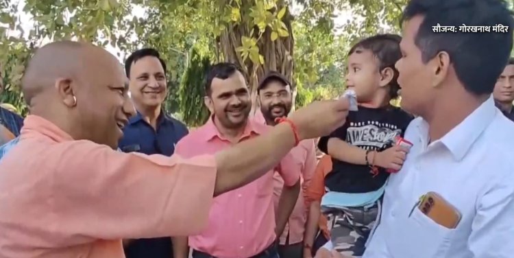 आज सीएम योगी जब गोरखनाथ मंदिर पहुंचे तो वहां पहले से लोग उनका इंतजार कर रहे थे. वहां सबसे पहले सीएम योगी एक बच्चे से मिलते हैं उसे अपने हाथ से चॉकलेट देते हैं.
