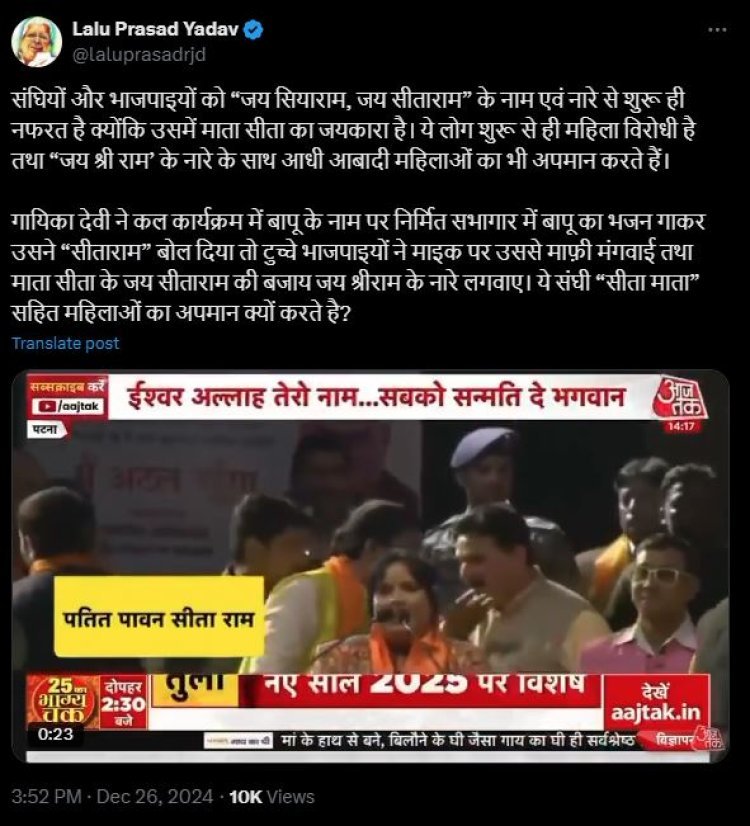 पूर्व मुख्यमंत्री लालू यादव ने कहा है कि ये लोग शुरू से ही महिला विरोधी है तथा ''जय श्री राम'' के नारे के साथ आधी आबादी महिलाओं का भी अपमान करते हैं. लालू यादव ने आगे लिखा कि गायिका देवी ने कल कार्यक्रम में बापू के नाम पर निर्मित सभागार में बापू का भजन गाकर उसने ''सीताराम'' बोल दिया तो टुच्चे भाजपाइयों ने माइक पर उससे माफ़ी मंगवाई तथा माता सीता के जय सीताराम की बजाय जय श्रीराम के नारे लगवाए. ये संघी ''सीता माता'' सहित महिलाओं का अपमान क्यों करते हैं?