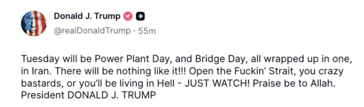 सोशल मीडिया पोस्ट में डोनाल्ड ट्रंप ने गाली का इस्तेमाल करते हुए लिखा, मंगलवार को 'पावर प्लांट डे' और 'ब्रिज डे' होगा. यानी साफ धमकी कि ईरान के बिजली घरों और पुलों पर हमले होंगे. 'होर्मुज खोलो, वरना जहन्नुम में रहोगे. बस देखते रहो.' 'अल्लाह की तारीफ करो.