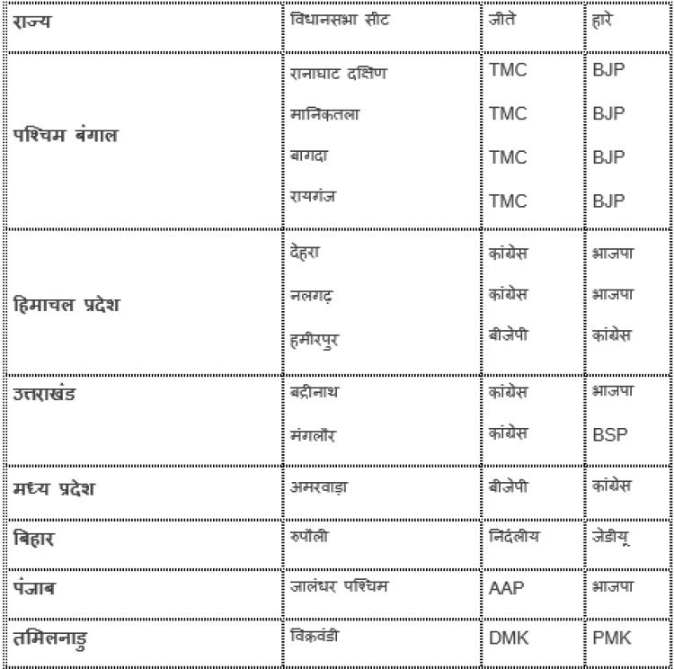 मध्य प्रदेश की अमरवाड़ा सीट पर, बिहार की रुपौली सीट पर, हिमाचल की हमीरपुर, देहरा और नलगढ़ सीट पर, उत्तराखंड की बद्रीनाथ, मंगलौर, पंजाब की जालंधर पश्चिम विधानसभा सीट पर, पश्चिम बंगाल की रानाघाट दक्षिण, रायगंज, बागदा, मानिकतला विधानसभा सीट पर और तमिलनाडु की विक्रवंडी विधानसभा सीट पर 10 जुलाई को चुनाव हुए थे. उपचुनाव में कांग्रेस ने 4, TMC ने 4, BJP ने 2, AAP, DMK और निर्दलीय ने 1-1 सीट जीती.