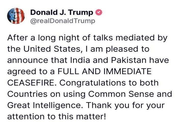 भारत-पाकिस्तान के बीच चल रहे तनाव के माहौल में अमेरिकी राष्ट्रपति डोनाल्ड ट्रंप ने एक ट्वीट किया है, जिसमें वो दावा कर रहे हैं कि भारत-पाकिस्तान पूर्ण सीजफायर के लिए तैयार हैं. बता दें कि आज दोपहर में ही पाकिस्तानी रक्षा मंत्री ने ट्रंप से जंग रुकवाने की गुहार लगाई थी.