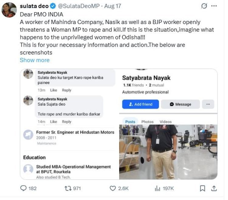 बीजद सांसद ने नायक द्वारा दी गई धमकियों के स्क्रीनशॉट्स को एक्स पर एक पोस्ट में साझा किया, जिसमें उन्होंने प्रधानमंत्री नरेंद्र मोदी, अमित शाह, आनंद महिंद्रा और ओडिशा के मुख्यमंत्री को टैग किया. देओ ने ट्वीट किया, "प्रिय पीएमओ इंडिया, महिंद्रा कंपनी, नासिक के एक कर्मचारी और बीजेपी कार्यकर्ता ने खुले तौर पर एक महिला सांसद को बलात्कार और हत्या की धमकी दी है. अगर यह स्थिति है, तो कल्पना करें कि ओडिशा की वंचित महिलाओं के साथ क्या होता होगा!" फेसबुक पर एक अन्य पोस्ट में, बीजद सांसद ने आरोप लगाया कि पुलिस ने अभी तक कोई कार्रवाई नहीं की है.