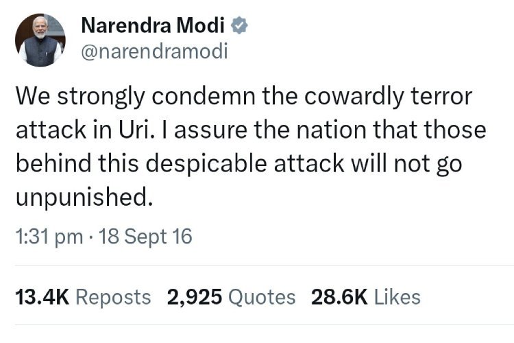 सितंबर 2016 में जम्मू-कश्मीर के उरी के अंदर भारतीय सेना पर सोते समय पाकिस्तानी आतंकवादियों द्वारा हमला कर दिया जाता है. जिसके बाद पीएम मोदी एक ट्वीट करते हैं, जिसमें पीएम साफ तौर पर लिखते हैं कि जिन लोगों ने ये हमला किया है उन्हें छोड़ा नहीं जाएगा. और इसके बाद पाकिस्तान के ऊपर भारतीय सेना की एक सर्जिकल स्ट्राईक की जाती है. जिसमें सैकड़ों आतंकियों को मौत की नींद सुलाया जाता है.