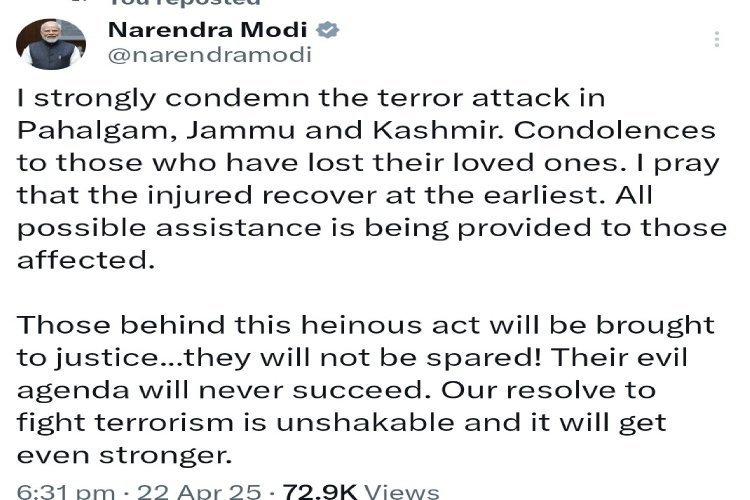 पहलगाम में हुए हमले के बाद प्रधानमंत्री मोदी ने ट्वीट किया है, जिसमें उन्होंने इस हमले की निंदा करते हुए इन आतंकियों को चेतवनी भी दी है. पीएम ने अपने ट्वीट में लिखा है कि- मैं जम्मू-कश्मीर के पहलगाम में हुए आतंकी हमले की कड़े शब्दों में निंदा करता हूँ। जिन्होंने अपने प्रियजनों को खोया है, उनके प्रति मेरी संवेदनाएँ हैं। मैं प्रार्थना करता हूँ कि घायल लोग जल्द से जल्द ठीक हों। प्रभावित लोगों को हर संभव सहायता प्रदान की जा रही है।