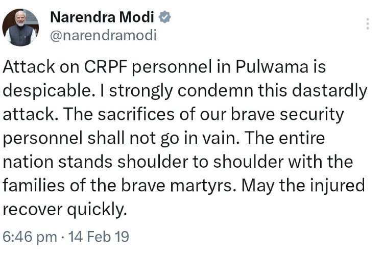 14 फरवरी 2019 को पुलवामा में सीआरपीएफ की टीम पर पाकिस्तानी आतंकी हमला करते हैं. इस हमले में देश अपने दर्जनों जवानों को खो देता है, पूरे देश में पाकिस्तान के खिलाफ गुस्सा था. और इसी दिन पीएम मोदी एक ट्वीट फिर से करते हैं. जिसमे वो साफ तौर पर लिखते हैं कि इस कारयराना हमले का बदला लिया जाएगा. जिसके बाद भारतीय सेना एक बार फिर बॉर्डर पार करती है. इस बार एयरस्ट्राइक की जाती है. जिसमें फिर से सैकड़ों आतंकियों को मार गिराया जाता है. साथ ही आतंकवादियों के लॉन्च पैड को भी नष्ट कर दिये जाते हैं.