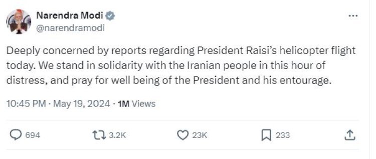 पीएम मोदी ने ट्वीट में लिखा ''आज राष्ट्रपति राईसी की हेलीकॉप्टर उड़ान के संबंध में रिपोर्टों से अत्यधिक चिंतित हूं. हम संकट की इस घड़ी में ईरानी लोगों के साथ एकजुटता से खड़े हैं, और राष्ट्रपति और उनके साथियों की भलाई के लिए प्रार्थना करते हैं''