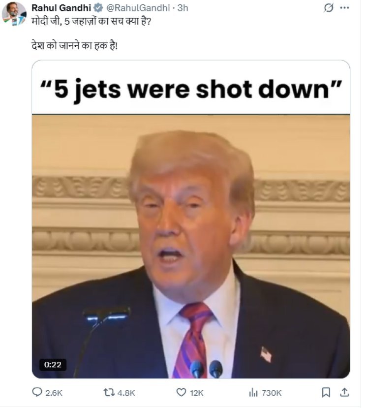 राहुल गांधी ने X पर लिखा, "मोदी जी, पांच जेट्स की सच्चाई क्या है? देश को जानने का हक है!" उन्होंने ट्रंप का एक वीडियो भी साझा किया, जिसमें ट्रंप यह दावा करते सुनाई दे रहे हैं. शुक्रवार को व्हाइट हाउस में रिपब्लिकन सीनेटरों के लिए आयोजित डिनर में ट्रंप ने कहा, "भारत और पाकिस्तान में हालात बिगड़ रहे थे, विमान हवा में मार गिराए जा रहे थे... चार या पांच. लेकिन मुझे लगता है कि पांच जेट्स मार गिराए गए. यह स्थिति और खराब हो रही थी, है ना?"
