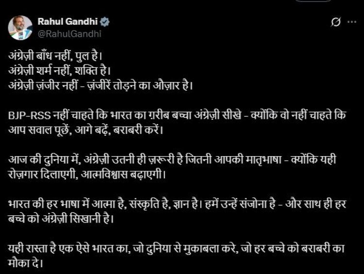 Rahul Gandhi trolled: लोकसभा में विपक्ष के नेता और कांग्रेस के पूर्व अध्यक्ष राहुल गांधी को हिन्दी से प्यार नहीं, बल्कि अंग्रेस के साथ दुलार है, वो मात्र भाषा का सम्मान नहीं बल्कि विदेशी भाषा की गुलामी करना चाहते हैं. कर्नाटक में राहुल की आत्मा कहां चली जाती है? ऐसे तमाम आरोप राहुल गांधी के ऊपर लग रहे हैं. क्योंकि राहुल गांधी ने हिंदी बनाम अंग्रेजी की जंग में एक ट्वीट किया है, जिसमें वो अंग्रेजी भाषा के कसीदे पढ़ते नजर आ रहे हैं, जबकि मात्र भाषा हिन्दी के सम्मान में एक भी शब्द नहीं लिखा गया है. आप पहले उस पोस्ट को पढ़िए कि क्या लिखा हुआ है.
