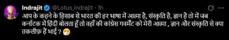 “आप के कहने के हिसाब से भारत की हर भाषा में आत्मा है, संस्कृति है, ज्ञान है तो में जब कर्नाटक में हिंदी बोलता हूँ तो वहाँ की कांग्रेस गवर्मेंट को मेरी आत्मा , ज्ञान और संस्कृति से क्या तकलीफ़ हैं भाई ? ????”