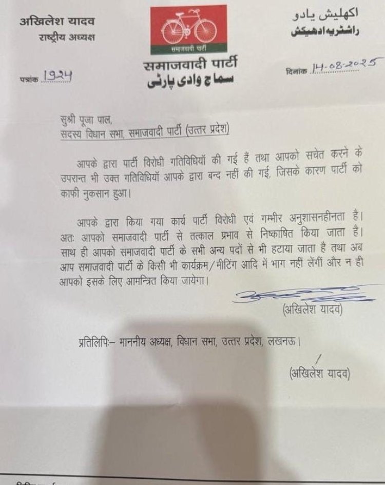 नई दिल्ली: सपा विधायक पूजा पाल को पार्टी ने निष्कासित कर दिया है. पूजा पाल ने उत्तर प्रदेश विधानसभा में खुलकर मुख्यमंत्री योगी आदित्यनाथ की तारीफ की थी. और अपने पति की हत्या के बाद मिले न्याय को लेकर सीएम योगी की जीलो टॉलरेंस नीतियों को सराहा था. पूजा पाल के इस रवैए से स्पष्ट हो गया था कि उनपर पार्टी कोई बड़ी कार्रवाई कर सकती है.