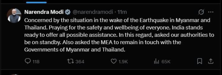 साथ ही बैंककॉक में 50 से अधिक लोगों के लापता होने की खबर मिल रही है. भूकंप के दौरान लोग और बचावकर्मी इधर-उधर भागते दिखे. इसी बीच भारत प्रधानमंत्री नरेंद्र मोदी ने चिंता जताई है. पीएम मोदी ने सोशल मीडिया प्लेटफॉर्म एक्स पर लिखा, '' म्यांमार और थाईलैंड में भूकंप के बाद की स्थिति से चिंतित हूं. सभी की सुरक्षा और खुशहाली के लिए प्रार्थना करता हूं. भारत हर संभव सहायता देने के लिए तैयार है. इस संबंध में, हमने अपने अधिकारियों से तैयार रहने को कहा है. साथ ही विदेश मंत्रालय से म्यांमार और थाईलैंड की सरकारों के साथ संपर्क में रहने को कहा है.