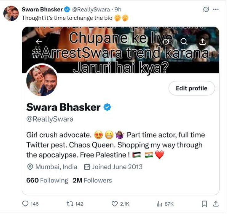 नई दिल्ली: अभिनेत्री स्वरा भास्कर ने हाल ही में एक फिल्म के बाद अपने एक्स बायो को अपडेट किया, जिसमें उन्होंने समाजवादी पार्टी की सांसद डिंपल यादव पर क्रश होने की बात स्वीकारी. भास्कर ने अपने बायो में 'गर्ल क्रश एडवोकेट' वाक्यांश जोड़ा. उन्होंने शुक्रवार सुबह अपने नए बायो का स्क्रीनशॉट साझा कर इस अपडेट को गर्व के साथ प्रदर्शित किया. वायरल साक्षात्कार में उन्होंने यह भी कहा कि लोग उभयलिंगी (बायसेक्सुअल) होते हैं.